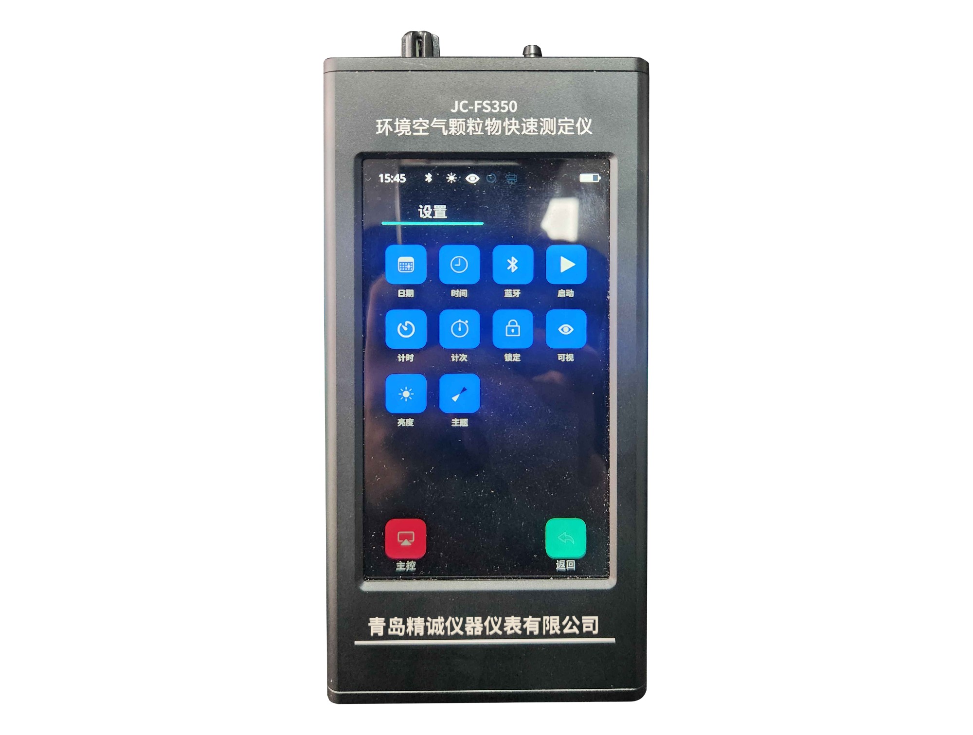 2、高清5.6寸彩色觸摸顯示屏,強光下可清晰顯示測量數據(時間、粉塵濃度、環境溫度、濕度、大氣壓、亮度、電量、充電狀態、打印、藍牙狀態、存儲、4種顏色曲線圖),可觸屏滑動解鎖及觸屏滑動開啟測量;